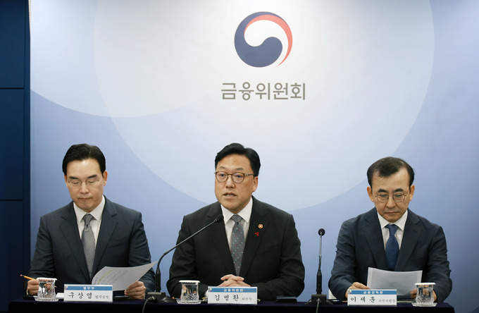 김병환 금융위원회 위원장(가운데)이 지난 2일 종로구 정부 서울 청사에서 일반주주 이익 보호 강화를 위한 자본시장법 개정 방향과 관련해 브리핑을 하고 있다. 정부는 민주당의 상법 개정안에 대한 대한으로 상장법인이 합병 등을 할 때 이사회가 주주이익을 보호하도록 노력해야 한다고 규정한 자본시장법 개정안을 국회에 제출했다. 김 위원장은 이 자리에서 “상법은 국내 회사 전체에 적용되는 일반법이어서 의도하지 않은 부작용이 크게 나타날 수 있다”고 밝혔다. 왼쪽부터 구상엽 법무부 법무실장, 김 위원장, 이세훈 금융감독원 수석부원장. 연합뉴스