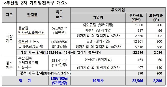 미래 먹거리 사업인 전력반도체·이차전지·자동차부품 관련 기업들의 투자계획이 제시된 부산 기장군과 강서구 지역 190만826.45㎡(57만5000평)가 기회발전특구로 지정됐다.