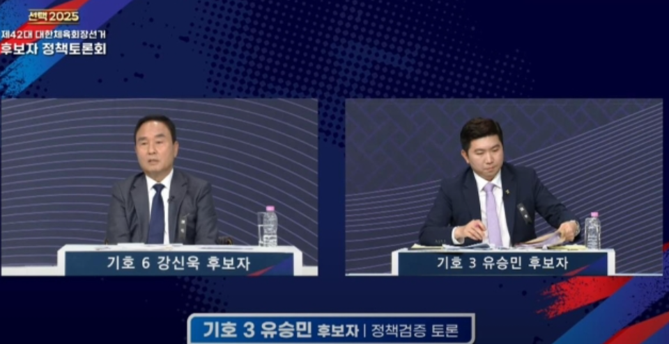 강 후보는 유 후보에 "탁구협회장 시절 후원금을 페이백했다는 의혹과 국가대표 선발 과정에서 선수를 바꿨다는 의혹이 SNS에 떠돈다"고 질문했다.