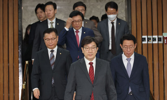 국민의힘 권성동 원내대표가 17일 오전 서울 여의도 국회에서 열린 원내대책회의에 참석하고 있다. 연합뉴스.