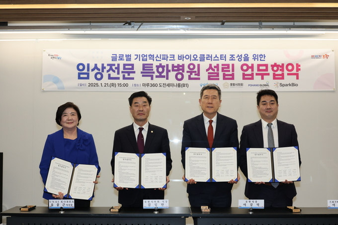 시는 21일 서울 강남구 소재 창업보육센터 마루360에서 포항시의회, 포항 글로벌 기업혁신파크 SPC, 스파크바이오와 ‘임상전문 특화병원 설립 업무협약’을 체결했다고 밝혔다.