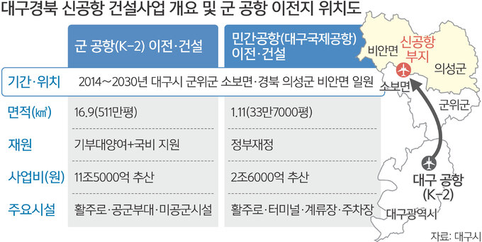 대구시가 제시한 TK신공항 건설사업 기본 계획안에 따르면 신공항은 2030년 개항을 위해 2026년 4월 착공을 목표로 하고 있다. ‘K-2 공군기지’라고도 불리는 대구 군 공항은 민간 대구국제공항과 함께 경북 군위·의성군 일대에 새로 건설되는 TK신공항으로 이전한다. TK신공항은 고속도로와 철도, 도심항공교통(UAM), 공항 도시 등 다양한 부대 시설이 입주해 국제공항으로서 면모를 갖출 것으로 시는 기대하고 있다.