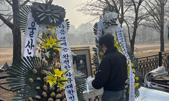 21일 오후 2시 경기 과천 공수처 맞은편의 공원 주변에는 “다음 세상에는 부정선거 없는 세상에서 살아주십시오” 등의 문구가 적힌 근조화환 3개와 고인을 추모하는 플래카드가 걸렸다. 몇몇 시민은 이곳을 찾아 묵념하는 등 고인을 추모했다.