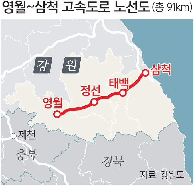 이번 사업이 예타를 통과하면 경기도 평택에서 강원도 삼척을 잇는 ‘동서 6축 고속도로’가 완성된다. 총 사업비는 5조2021억원으로 강원도 사회간접자본(SOC) 사업 중 최대 규모다.