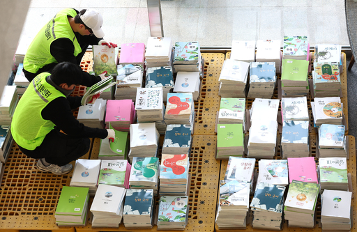 23일 대구 수성구 정화여자고등학교에서 대구학교지원센터 관계자들이 2025학년도 새학기에 쓸 교과서들을 과목·학년별로 분류하고 있다.