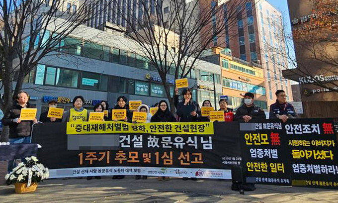 지난해 1월 공사장에서 작업 중 숨진 문씨의 유족은 23일 1심 선고 뒤 마포구 공덕소공원에서 문모씨 1주기 추모식 및 기자회견을 열었다. 연합뉴스