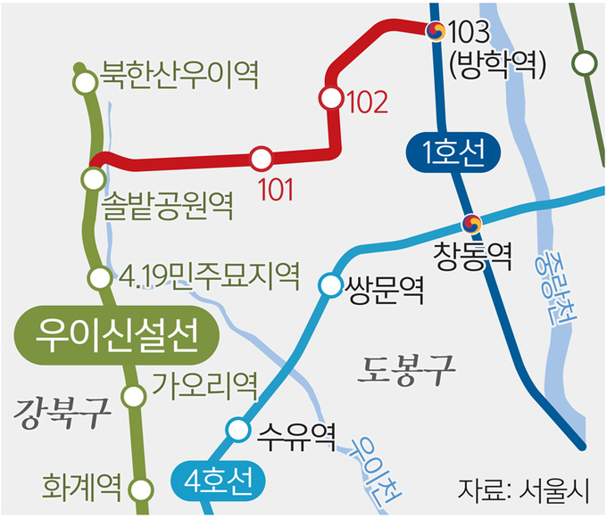 서울시 경전철 우이신설선이 2031년 연장돼 1호선 방학역과 연결되고 3개 정거장이 새로 들어선다.