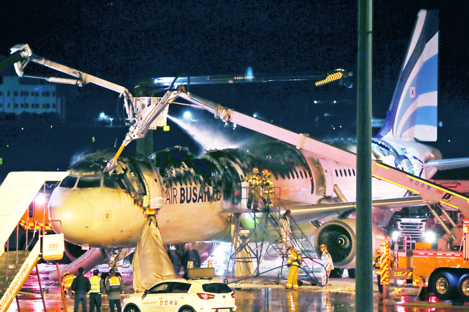 29일 부산소방재난본부에 따르면 전날 오후10시26분 부산 강서구 대저동 김해공항 계류장에서 홍콩으로 출발할 예정이던 에어부산 BX391편 내부 뒤편에서 원인을 알 수 없는 연기가 피어오르며 화재가 발생했다. 불은 항공기 동체 앞부분으로 빠르게 확산해 항공기가 전소됐다.