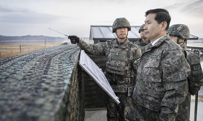 김선호 국방부장관 직무대행은 29일 오전 육군 9사단 강안 경계부대를 방문해 작전 태세를 점검하고 장병들을 격려했다.