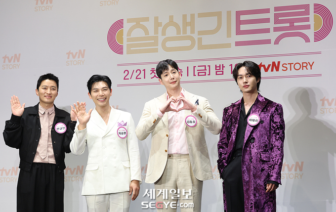 인교진, 지승현, 김동호, 이태리(사진 왼쪽부터)가 4일 라마다서울신도림호텔에서 열린 tvN STORY '잘생긴 트롯'의 제작발표회에 참석해 포즈를 취하고 있다.