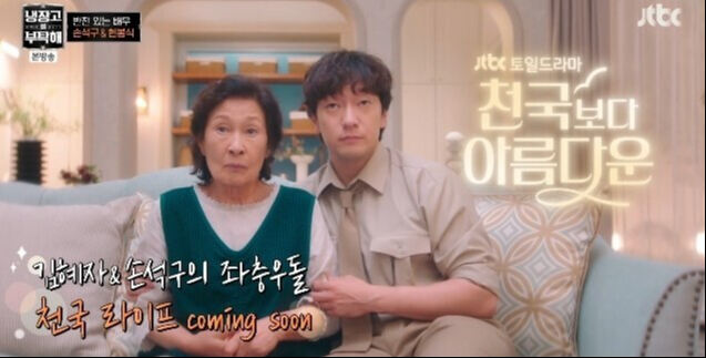 손석구는 냉장고를 부탁해에서 4월 방영 예정인 드라마 ‘천국보다 아름다운’의 출연 소식과 일화를 이야기했다. 손석구는 “인생의 석양에 접어든 한 부부의 사랑 이야기인데 저는 거기서 김혜자 선생님의 남편으로 나온다”고 전했다.