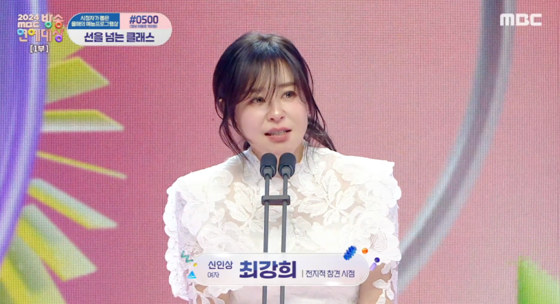 ‘2024 MBC 방송연예대상’ 여자 신인상 후보는 최강희를 포함해 가수 송지은(전지적 참견 시점)과 배우 윤가이(나 혼자 산다), 가수 이해리(송스틸러) 등 쟁쟁한 후보들이었다. 그는 신인상 수상자에 자신의 이름이 호명되자 놀란 표정으로 무대에 올랐다.