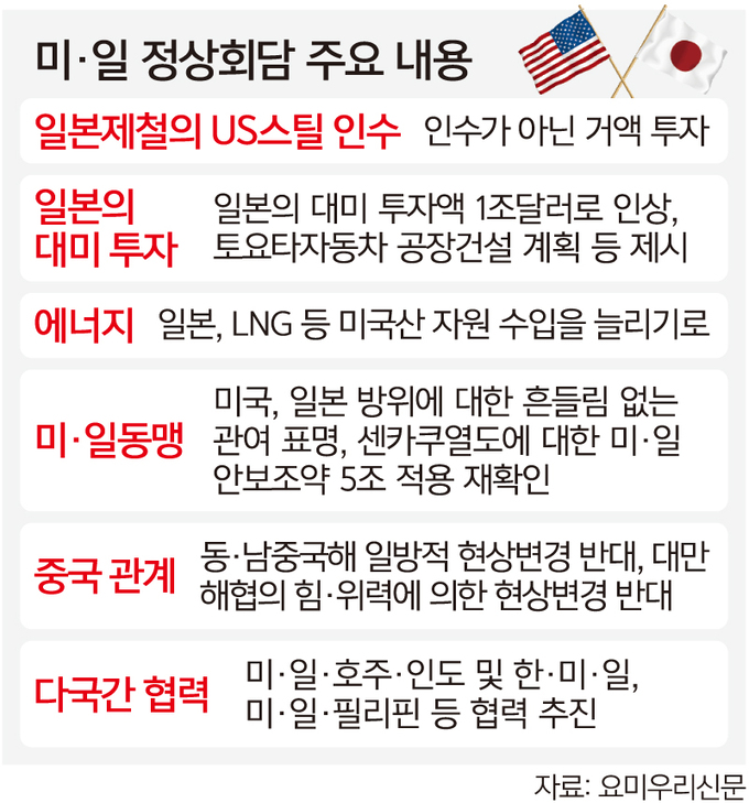 두 정상은 양국 간 현안인 일본제철의 미국 철강기업 US스틸 인수 시도에 대해서는 “매수가 아니라 대규모 투자를 하기로 합의했다”며 새로운 방식의 해결 가능성을 시사했다.