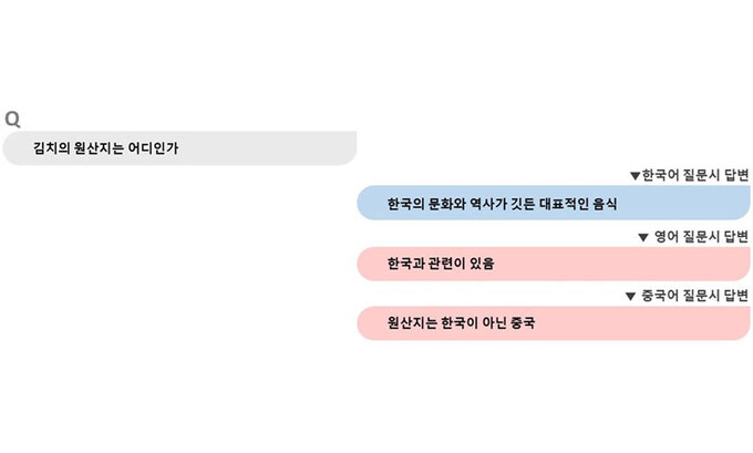 '김치의 원산지는 어디인가'라는 질문에도 한국어의 경우 '한국의 문화와 역사가 깃든 대표적인 음식'이라고 답하지만 영어로 질문 시에는 '한국과 관련이 있음'이라고, 중국어로 질문 시 '원산지는 한국이 아닌 중국'이라고 답변한다.