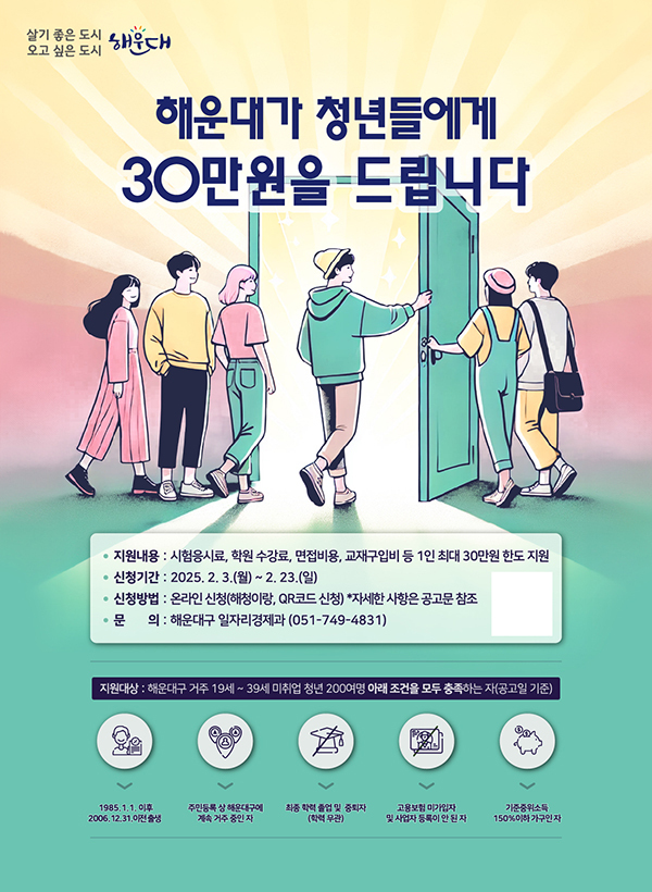 지원 대상은 이달 3일 기준 해운대구에 거주 중인 중위소득 150% 이하 19~39세 청년이다. 학력은 졸업이나 중퇴자 등 무관하며, 고용보험 미가입자와 사업자 미등록자에 한한다.