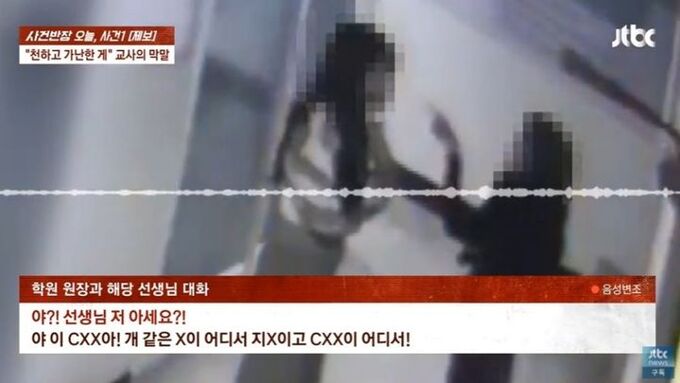 학원 강사 A씨는 다짜고짜 반말하며 따지는 B씨에게 "선생님 저 아세요?"라고 물었고, 이에 B씨는 "이 XXX아. 개 같은 X이 어디서 지X이냐. 이 조그마한 곳에서 애들 돈 뽑아 먹으려면 똑바로 가르쳐라. 미친X아"라고 했다.