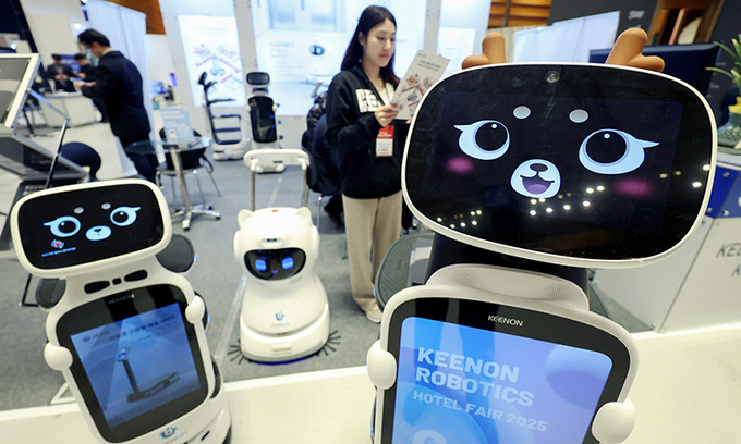 12일 서울 강남구 코엑스에서 열린 ‘2025 호텔페어’에서 키논 로보틱스의 자율주행 로봇인 ‘다이너봇’이 관람객들을 맞이하고 있다. 호텔 운영과 고객 서비스에 최적화된 키논 로보틱스의 스마트 호텔 로봇은 이미 5000만개 이상의 객실 배송과 4000개 이상의 스마트 호텔에 구축돼 신뢰성과 기술력을 입증했다고 회사 측은 설명했다. 이날 키논 로보틱스는 음식의 서빙 및 퇴식을 안내하는 ‘다이너봇’을 비롯해 청소로봇, 배송로봇, 물류로봇 등 다양한 서비스용 로봇을 공개했다.