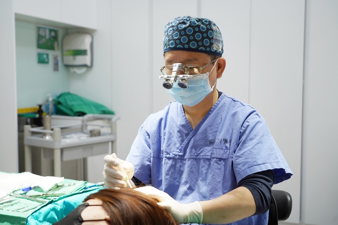 황성주 명지병원 탈모이식센터장이 지난 14일 시술하는 모습. 명지병원 제공