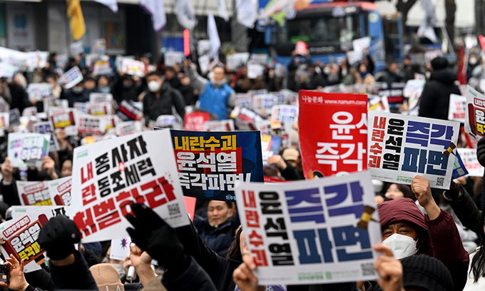 지난 15일 광주 동구 금남로와 5·18민주광장 일대에서 윤석열 정권 즉각 퇴진·사회대개혁 광주비상행동 주관으로 열린 제14차 광주시민총궐기대회에서 참석자들이 '윤 대통령 탄핵' 촉구 손팻말을 들어올리고 있다. 뉴시스