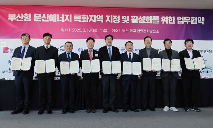18일 부산시에 따르면 시는 이날 오후 부산 강서구 에코델타시티 내 명지 연료전지 발전소에서 한국수자원공사, 발전업체, 강서구 등 8개 기관·기업과 ‘부산형 분산에너지 특화지역 지정 및 활성화를 위한 업무협약’을 체결했다.