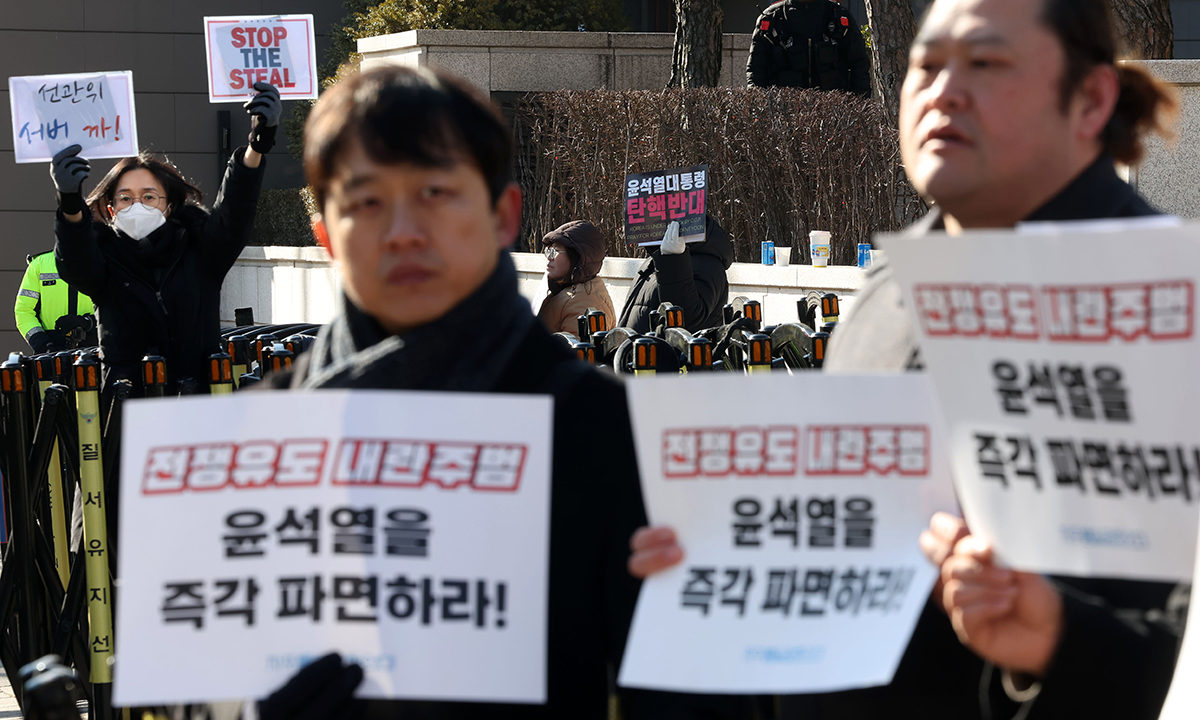 21일 서울 종로구 헌법재판소 앞에서 자주통일평화연대 주최로 전쟁유도 내란범죄자 윤석열 파면 촉구 기자회견이 진행되는 가운데 탄핵 반대 시민들이 부정선거 중단 관련 피켓을 들고 있다. 뉴시스