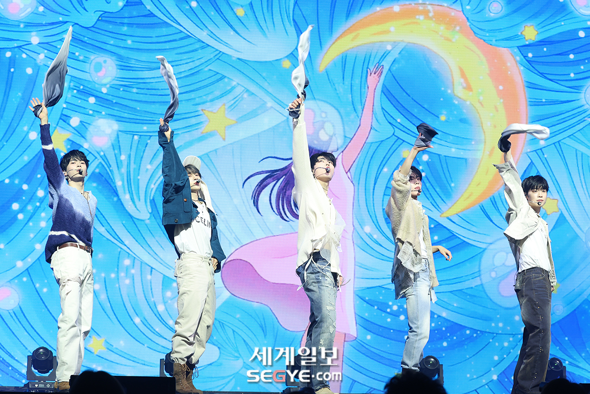 그룹 제로베이스원(ZEROBASEONE)이 24일 서울 한남동 블루스퀘어에서 진행된 미니 5집 '블루 파라다이스(BLUE PARADISE)' 발매 기념 미디어 쇼케이스에 참석해 열띤 공연을 펼치고 있다.