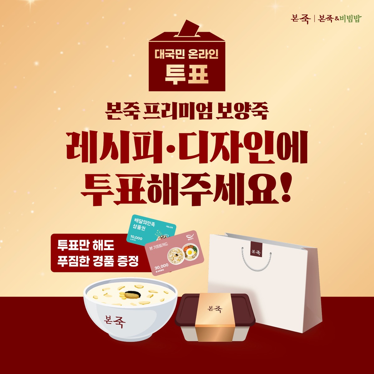 아울러 온라인 고객 투표에 참여한 고객들에게는 감사의 마음을 담아 추첨을 통해 본죽 및 본죽&비빔밥 할인쿠폰을 증정할 계획이다.