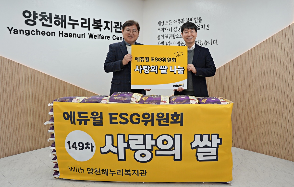 종합교육기업 에듀윌이 서울 양천구에 위치한 양천해누리복지관에 ‘사랑의 쌀’ 100포대를 전달했다고 25일 밝혔다.