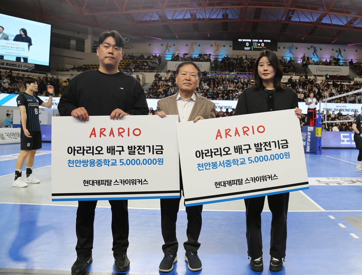 아라리오는 천안 유관순체육관에서 열린 현대캐피탈 스카이워커스 배구단 홈경기에서 지역 배구 유망주들을 위한 발전기금으로 천안 봉서중학교와 쌍용중학교 배구부에 각각 5백만원씩 모두 1000만원을 전달했다고 27일 밝혔다.