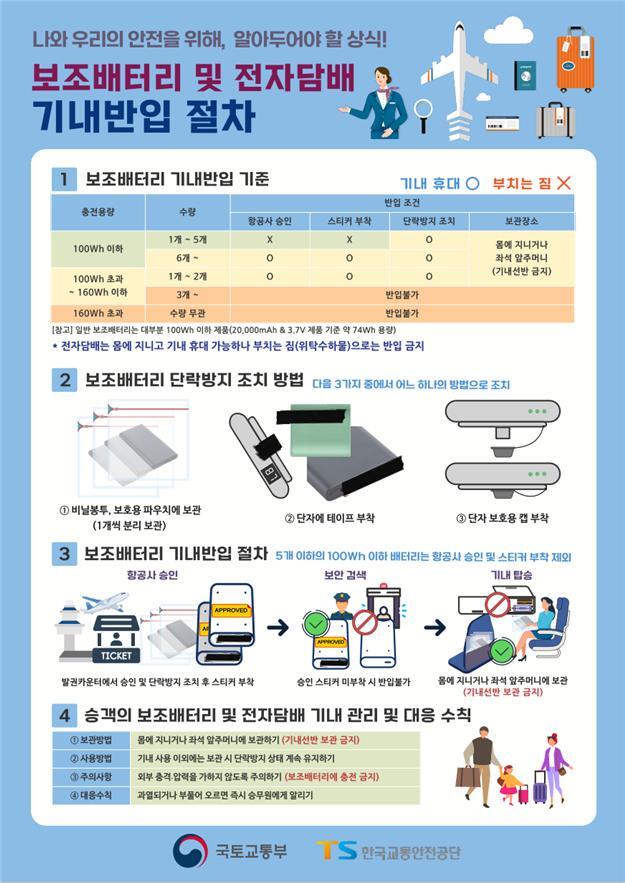 국토교통부의 보조배터리 및 전자담배 관리절차 표준안에 따르면 기내 반입이 허용되는 보조배터리는 100Wh 이하 최대 5개까지, 100Wh~160Wh는 항공사 승인하에 2개까지이며, 160Wh를 초과하면 기내반입이 금지된다.