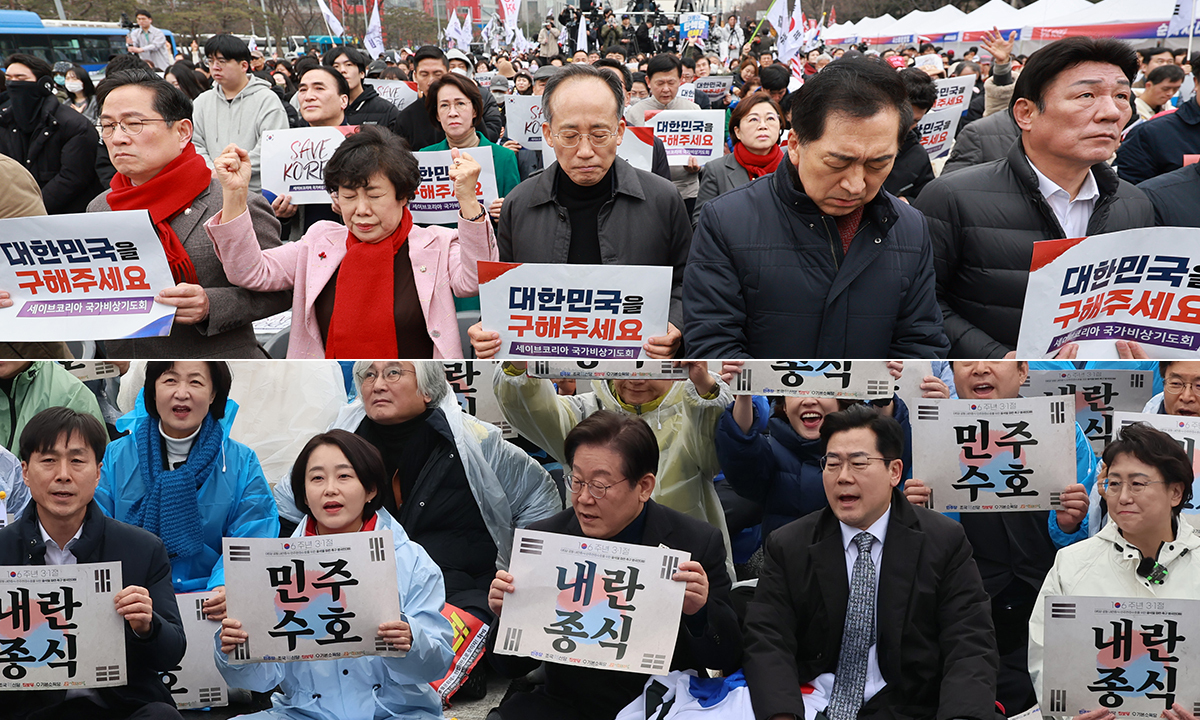 반면 더불어민주당 의원 130여명을 비롯해 조국혁신당 등 야 5당 의원은 전날 종로구 안국동 헌법재판소 인근에서 공동으로 대규모 집회를 열고 윤 대통령 파면과 국민의힘 심판을 주장했다. 이들은 탄핵 반대파를 “내란 동조세력”이라고 공격하며 국민의힘의 해체를 주장하기도 했다.