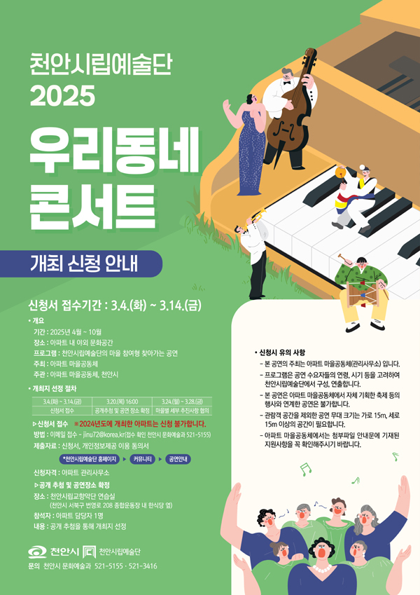 충남 천안시는 오는 14일까지 천안시립예술단의 마을 참여형 기획공연 ‘우리동네콘서트’ 개최를 희망하는 아파트와 마을을 모집한다고 4일 밝혔다.