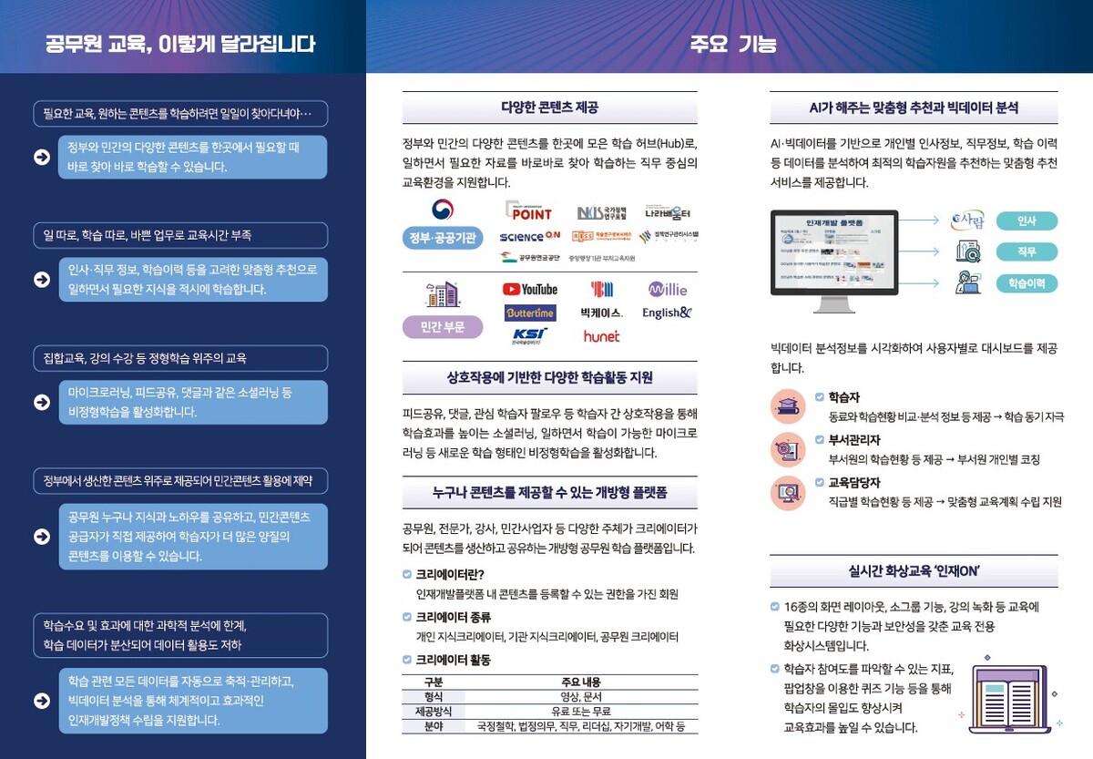 인사혁신처는 4일 공무원의 인공지능(AI) 이해도를 높이고 실무 활용 역량을 강화하기 위해 국가공무원 맞춤형 온라인 교육 플랫폼인 ‘인재개발플랫폼’에 AI 전용관을 만들었다고 밝혔다.