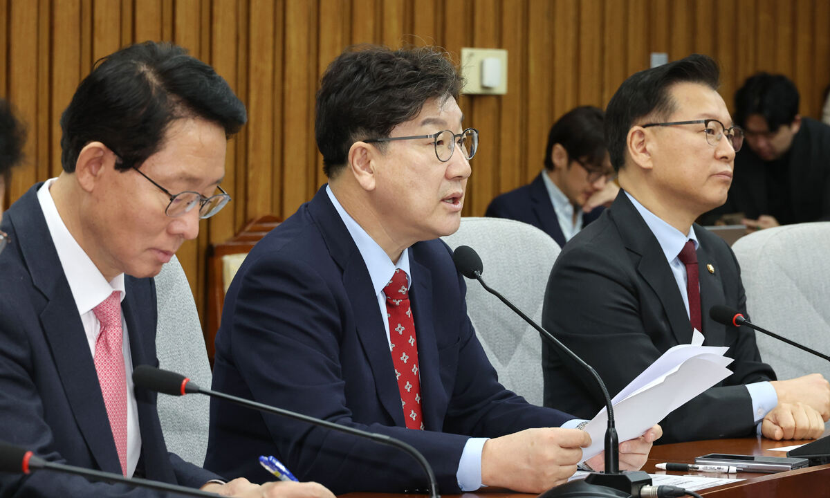 국민의힘 권성동 원내대표(가운데)가 4일 서울 여의도 국회에서 열린 원내대책회의에서 발언하고 있다. 연합뉴스