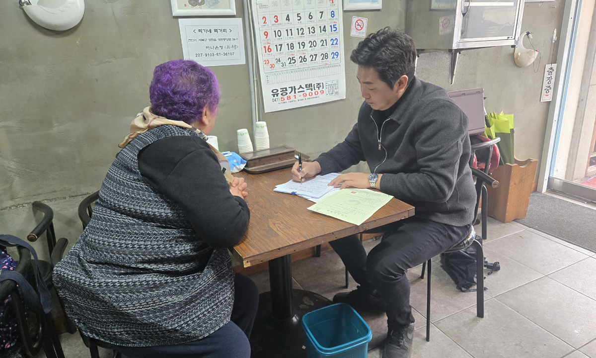 충남 천안시의회 김철환 시의원이 지원제도를 몰라 지원금을 못 받는 자영업자들이 생길 것을 우려해 현장에서 지원금 신청서를 작성해 주고 있다.