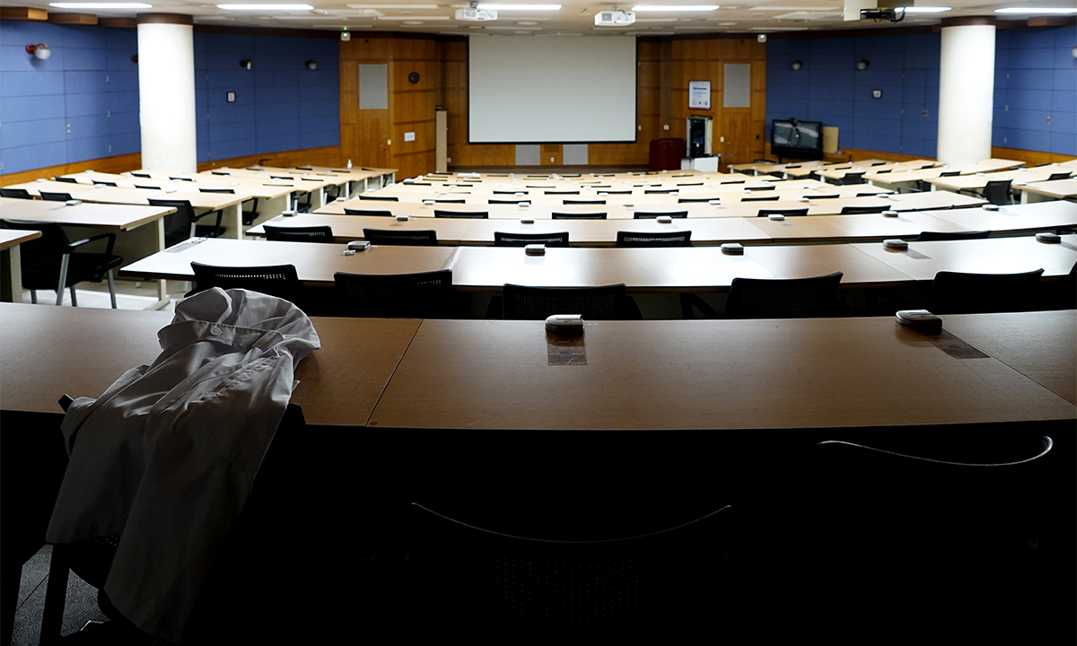 [대구=뉴시스] 이무열 기자 = 4일 대구의 한 의과대학 강의실에 의대 가운만 덩그러니 놓여있다. 전국 의과대학 40곳 중 10곳의 수강신청 인원이 전무한 것으로 집계됐다. ‘2025학년도 1학기 의대 수강신청 현황' 자료에 따르면, 지난달 25일 기준 전국 40개 의대 수강신청 인원은 총 4219명이다. 현재까지 개강을 미룬 곳은 5곳이다. 가톨릭대 의대는 예과 1학년과 본과 모두 개강을 4월 28일로 연기했다. 고신대와 제주대, 강원대, 울산대는 본과만 개강을 미뤘다. 2025.03.04. lmy@newsis.com