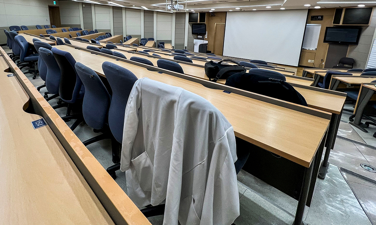 취재진이 찾은 서울대 의대에선 일부 학생만 수업에 참여했다. 학생관 내부 수백명 규모의 1강의실에선 의대 본과생 약 10여명만 모여 수업을 듣고 있었다. 이들은 유급 또는 제적 위기에서 벗어나기 위해 수업에 참여한 것으로 보인다. 학생들은 기자 질의에 “할 말이 없다”고 손사래를 쳤다. 의대 내에서 이뤄지는 ‘배신자 낙인’을 우려하는 듯한 모습이었다.