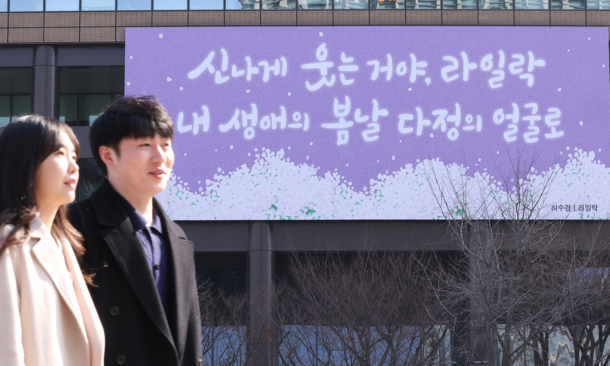 지나간 일은 잊고, 더 나은 내일을 향해 나아가요 입력 : 2025-03-06 18:29:47 수정 : 2025-03-06 18:29:46 남정탁 기자 구글 네이버 유튜브 6일 서울 종로구 교보생명빌딩 외벽에 걸린 광화문글판 봄편에 허수경(1964∼2018) 시인의 시 ‘라일락’의 한 구절이 새겨져 있다. 지나간 일은 잊고, 더 나은 내일을 향해 나아가자는 메시지를 담고 있으며, 기나긴 겨울을 보내고 봄이 되면 활짝 피어나 향기를 내뿜는 라일락에 빗댔다. 남정탁 기자 Copyright ⓒ 세계일보. 무단 전재 및 재배포 금지 세계일보 남정탁