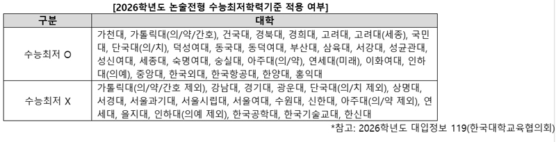논술전형은 학교생활기록부를 반영하기도 하지만 대부분 비중이 작고, 실질 영향력이 매우 낮은 편이다. 삼육대·서강대·성신여대는 올해 학생부 반영을 없애 대학수학능력시험 100% 선발로 변경했고, 광운대·서울시립대 등은 학생부(교과) 반영비율을 기존 30%에서 20%로 낮췄다.