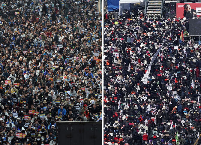 법원의 윤석열 대통령 구속 취소 결정 이후 첫 주말인 8일 서울 도심 곳곳에서 윤 대통령 탄핵 찬반 집회가 열렸다. 사진 왼쪽은 종로구 안국동에서 열린 찬성집회 '야5당 공동 윤석열 파면 촉구 2차 범국민대회'. 오른쪽은 광화문 광장에서 열린 탄핵 반대집회'자유통일을 위한 국민대회'.   뉴스1