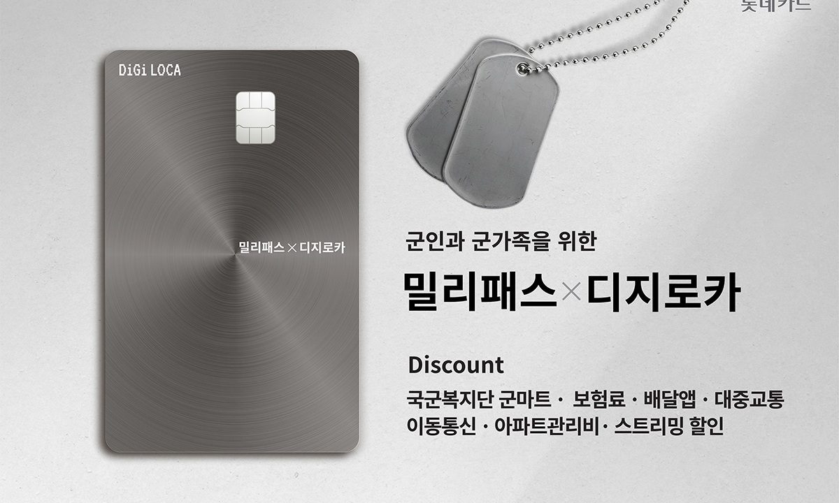 아울러 31일까지 국군복지단 군마트와 국군복지단 체력단련장(골프장)에서 ‘밀리패스X디지로카 카드’로 결제 시 결제금액의 최대 20%(각각 5000원 한도)를 할인해 준다. 카드 신청은 밀리패스와 롯데카드 앱 또는 홈페이지에서 가능하다. 연회비는 2만원(국내전용·해외겸용)이다.