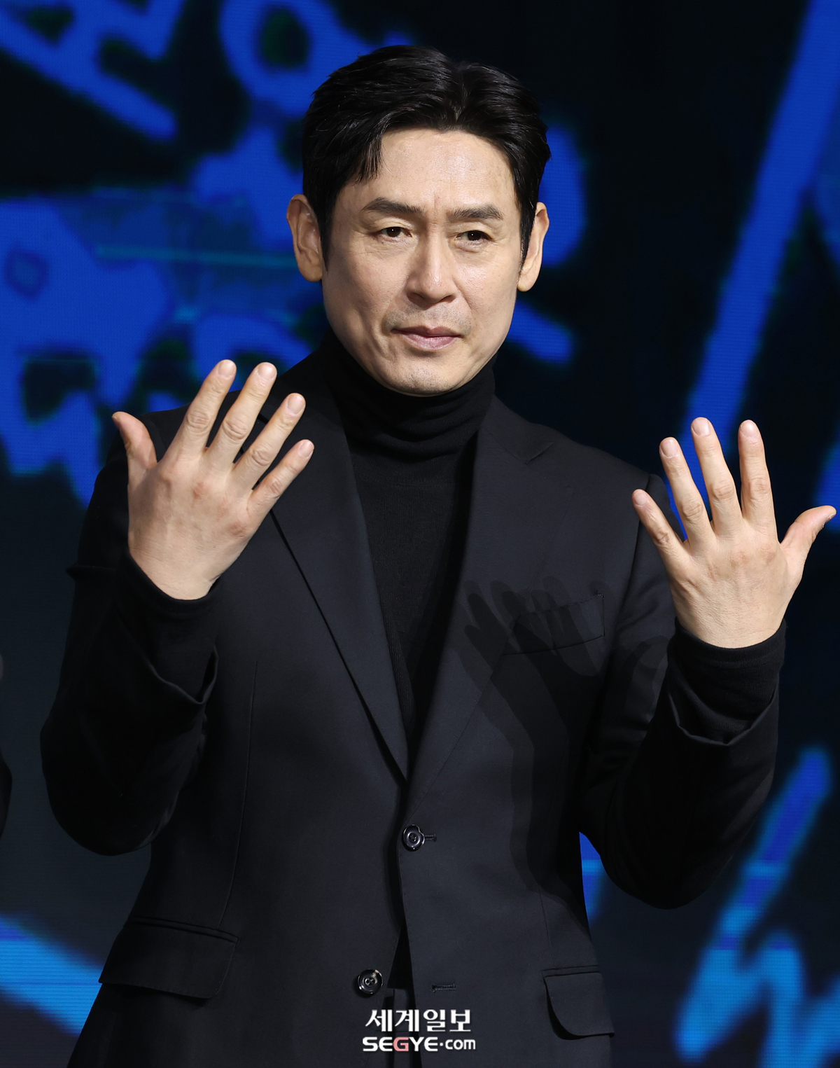 배우 설경구가 17일 오전 서울 영등포구 콘래드호텔에서 열린 디즈니플러스 '하이퍼나이프' 제작발표회에 참석해 포즈를 취하고 있다.