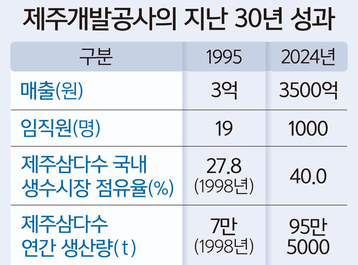제주삼다수는 연간 생산량이 출시 첫해인 1998년 7만t에서 2024년 95만5000t으로 늘었다. 국내 생수시장 점유율은 출시 한 달 만에 27.8%에서 현재 40%를 넘기며 출시 이후 26년간 1위 자리를 지키고 있다. 공사 매출의 60∼70%를 차지하는 효자 종목이다. 연간 생산량의 1%인 1만t을 동남아, 중국 등 21개국에 수출하고 있다. 2027년까지 수출 물량을 최대 10만~15만t까지 확대할 계획이다.