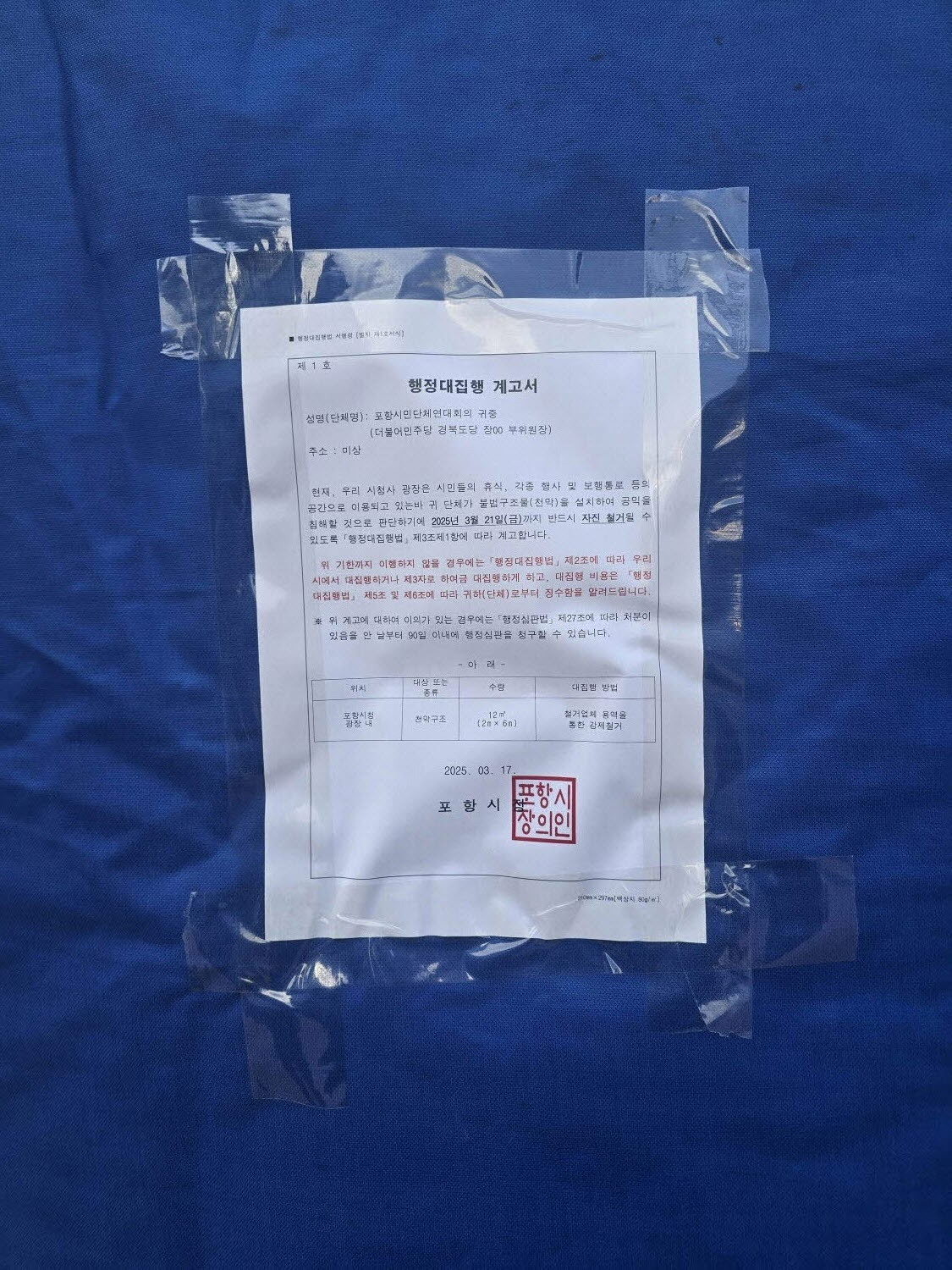 윤석열 대통령 퇴진을 촉구하는 시민단체의 천막 농성에 대해 17일 부착된 행정대집행 계고서. 포항시 제공