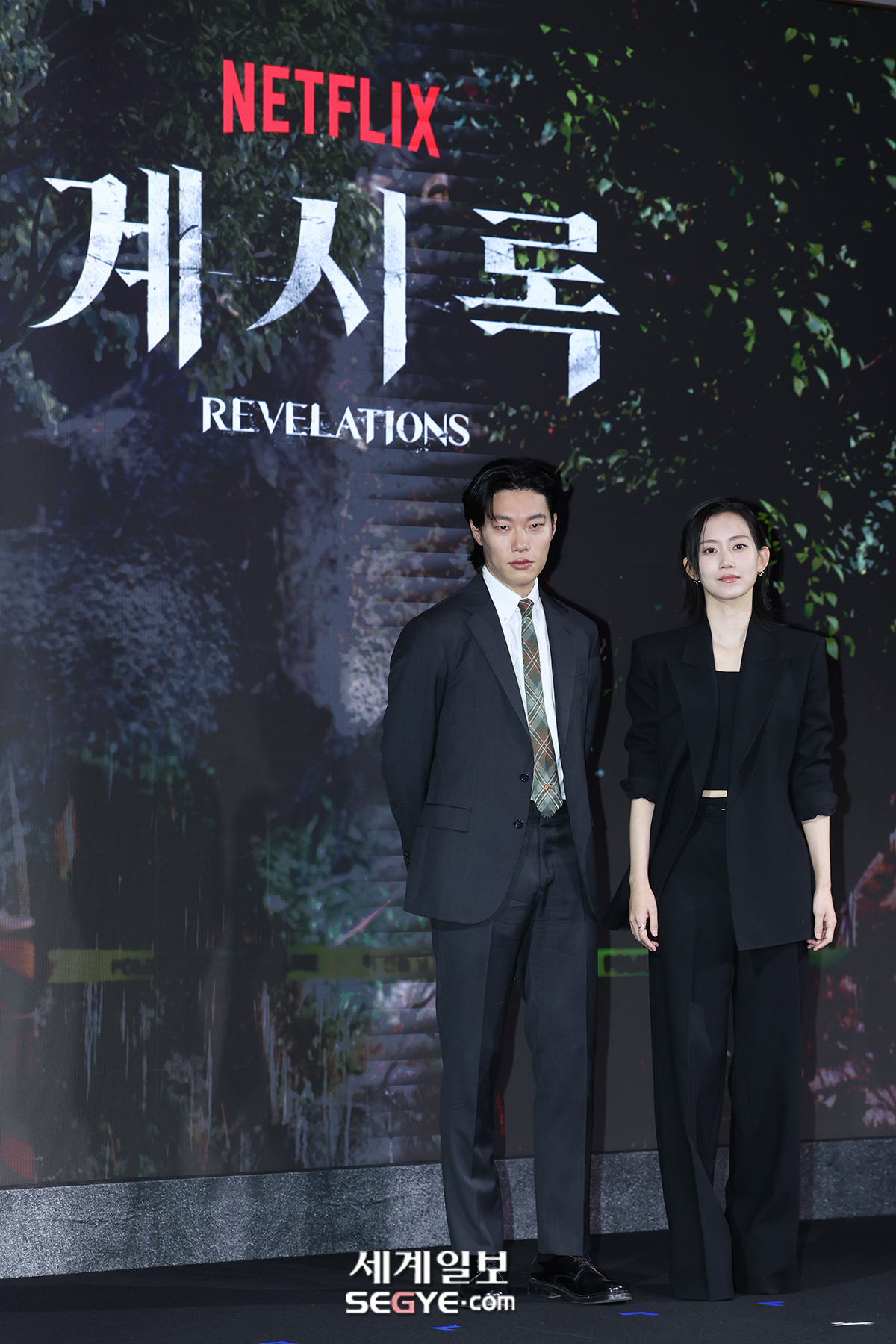배우 류준열(사진 왼쪽)과 신현빈이 18일 오전 서울 호텔 나루 서울 엠갤러리에서 열린 넷플릭스(Netflix) 영화 ‘계시록’의 제작보고회에 참석해 포즈를 취하고 있다.