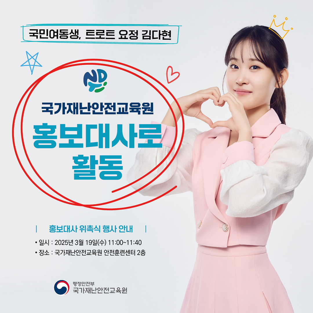 19일 오전 11시 충남 공주시 행안부 국가재난안전교육원 안전훈련센터에서 열린 위촉식에서 문영훈 국가재난안전교육원장은 “김다현양의 밝고 친근한 이미지가 재난안전 교육의 중요성을 알리는 데 큰 도움이 될 것으로 기대한다”며 “국가재난안전교육원은 앞으로도 국민의 재난 대응 역량 강화를 위해 다양한 교육 프로그램을 개발하고 홍보하는 데 힘쓰겠다”고 밝혔다.