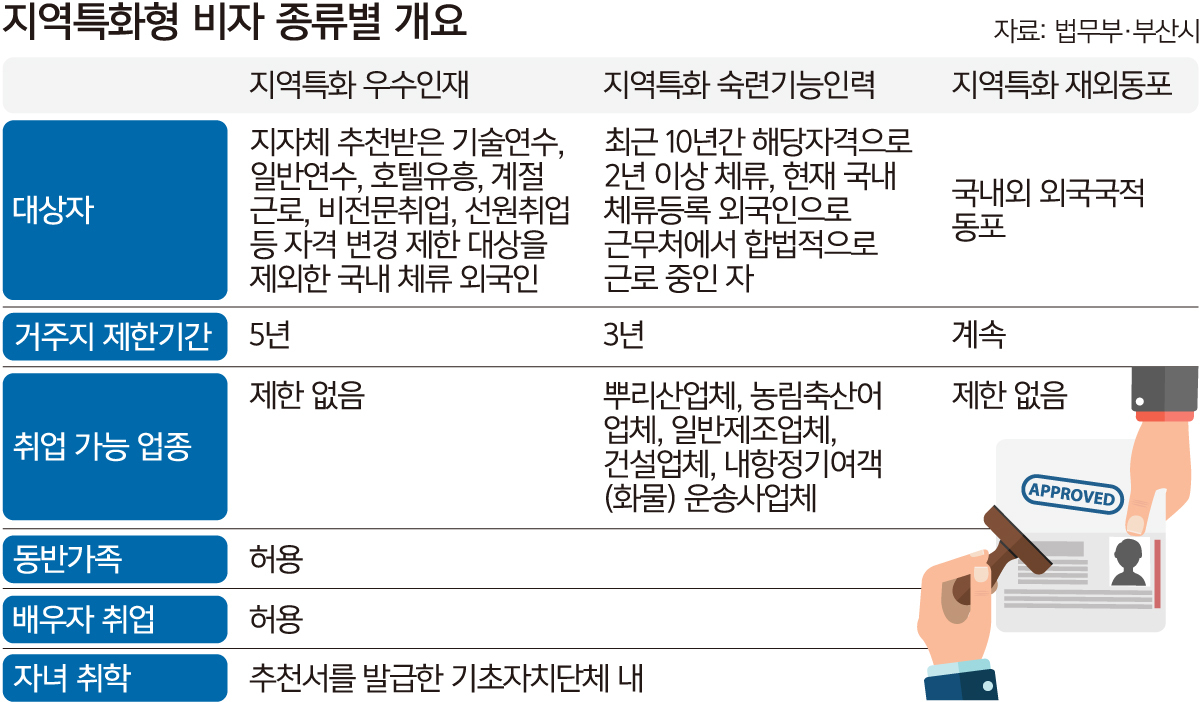 지역특화형 비자 사업은 지역에 필요한 외국인에게 비자 특례를 부여해 지역사회 정착시켜 생활 인구를 확대하고, 경제활동 촉진과 인구 유출 억제 등을 목적으로 법무부에서 추진하는 외국인 정책 사업이다. 부산에서는 인구감소지역인 서구·동구·영도구와 인구감소관심지역인 중구·금정구에서 추진할 예정이다.