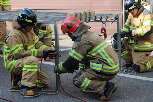 경북 포항북부소방서가 20일 실시한 화재·구조·구급 분야 전술훈련 평가에서 대원들이 로프매듭법 등을 선보이고 있다. 현장활동의 기본이 되는 전술·전략의 숙달로 현장적응성을 향상시키고 업무 분야별 인적자원의 전문성을 강화하는 데 목적이 있는 전술평가는 소방공무원을 상대로 상·하반기 연 2회씩 진행된다.