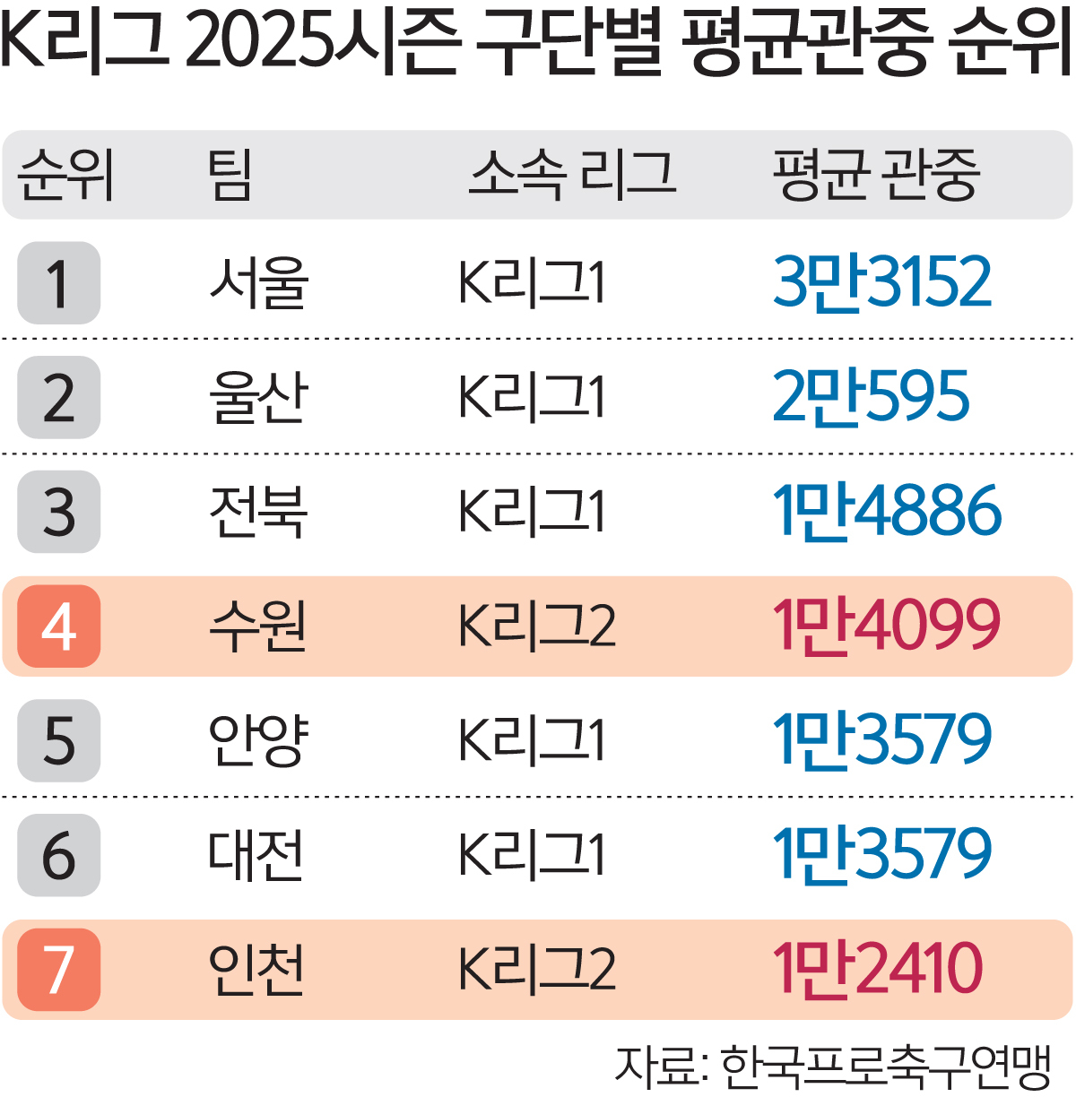 2025시즌 28경기를 치른 K리그2에 유료관중 13만6167명이 몰렸다. 경기당 평균 관중은 4863명으로 역대 최다다. K리그2 관중은 매 시즌 급격한 성장세를 기록 중이다. 최근 3년 새 평균관중 증가율은 105.5%로 두 배 이상 늘었을 정도다.