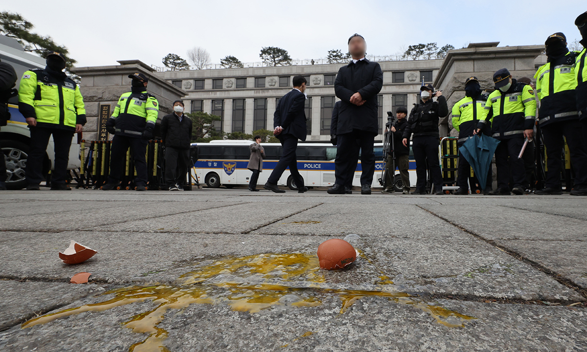 20일 더불어민주당 의원들이 기자회견 도중 날계란을 맞으면서, 경찰의 헌재 경비 태세는 한층 더 강화됐다. 이날 오전 민주당 백혜련 의원과 이건태 의원은 윤 대통령의 신속한 파면을 촉구하는 회견을 하다 건너편 인도에서 날아온 계란을 맞았다. 건너편 인도에는 태극기와 성조기를 든 윤 대통령 지지자들이 있었는데, 계란 외에도 바나나 여러 개도 던진 것으로 파악됐다. 경찰은 이 사태 이후 ‘1인시위를 벗어난 행태를 하고 있다’며 헌재 건너편 시위자들에 대한 강제 해산에 나섰다.